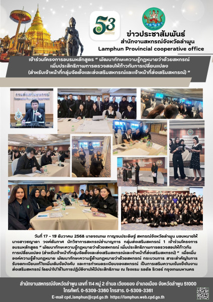 วันที่ 17 - 19 ธันวาคม 2568 นายจณภพ กาญจนประดิษฐ์ สหกรณ์จังหวัดลำพูน มอบหมายให้ นางสาวชญาดา วงศ์ตันกาศ นักวิชาการสหกรณ์ชำนาญการ กลุ่มส่งเสริมสหกรณ์ 1 เข้าร่วมโครงการอบรมหลักสูตร “พัฒนาทักษะความรู้กฎหมายว่าด้วยสหกรณ์ เพิ่มประสิทธิภาพการตรวจสอบให้ก้าวทันการเปลี่ยนแปลง (สำหรับเจ้าหน้าที่กลุ่มจัดตั้งและส่งเสริมสหกรณ์และเจ้าหน้าที่ส่งเสริมสหกรณ์)” เพื่อเพิ่มองค์ความรู้ด้านกฎหมาย พัฒนาทักษะความรู้ด้านกฎหมายว่าด้วยสหกรณ์ กระบวนการ สาระสำคัญในการรับจดทะเบียนแก้ไขเพิ่มเติมข้อบังคับ และการกำหนดระเบียบของสหกรณ์ เป็นการเสริมความเข้มแข็งในงานส่งเสริมสหกรณ์ โดยนำไปใช้ในการปฏิบัติงานให้มีประสิทธิภาพ ณ โรงแรม รอยัล ริเวอร์ กรุงเทพมหานคร