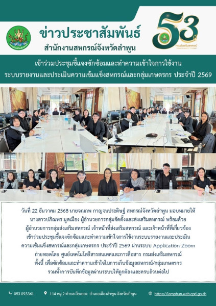 วันที่ 22 ธันวาคม 2568 นายจณภพ กาญจนประดิษฐ์ สหกรณ์จังหวัดลำพูน มอบหมายให้ นางสาวปภิณพร มูลเมือง ผู้อำนวยการกลุ่มจัดตั้งและส่งเสริมสหกรณ์ พร้อมด้วย ผู้อำนวยการกลุ่มส่งเสริมสหกรณ์ เจ้าหน้าที่ส่งเสริมสหกรณ์ และเจ้าหน้าที่ที่เกี่ยวข้อง เข้าร่วมประชุมชี้แจงซักซ้อมและทำความเข้าใจการใช้งานระบบรายงานและประเมินความเข้มแข็งสหกรณ์และกลุ่มเกษตรกร ประจำปี 2569 ผ่านระบบ Application Zoom ถ่ายทอดโดย ศูนย์เทคโนโลยีสารสนเทศและการสื่อสาร กรมส่งเสริมสหกรณ์ ทั้งนี้ เพื่อซักซ้อมและทำความเข้าใจในการเก็บข้อมูลสหกรณ์/กลุ่มเกษตรกร รวมทั้งการบันทึกข้อมูลผ่านระบบให้ถูกต้องและครบถ้วนต่อไป