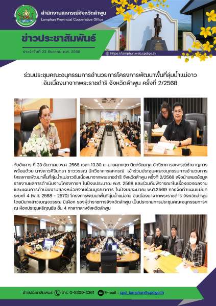 วันที่ 23 ธันวาคม พ.ศ. 2568 เวลา 13.30 น. นายศุภกฤต ดิตถ์รัตนกุล นักวิชาการสหกรณ์ชำนาญการ พร้อมด้วย นางสาวศิรินทรา ขาววรรณ นักวิชาการสหกรณ์ เข้าร่วมประชุมคณะอนุกรรมการอำนวยการโครงการพัฒนาพื้นที่ลุ่มน้ำแม่อาวอันเนื่องมาจากพระราชดำริ จังหวัดลำพูน ครั้งที่ 2/2568 เพื่อนำเสนอข้อมูลรายงานผลการดำเนินงานโครงการฯ ในปีงบประมาณ พ.ศ. 2568 และร่วมกันพิจารณาในเรื่องของผลงานและแผนการดำเนินงานของหน่วยงานร่วมบูรณาการ ในปีงบประมาณ พ.ศ.2569 การจัดทำแผนแม่บทระยะที่ 4 (พ.ศ. 2568 - 2570) โครงการพัฒนาพื้นที่ลุ่มน้ำแม่อาว อันเนื่องมาจากพระราชดำริ จังหวัดลำพูนโดยมีนางสาวเบญจวรรณ มีเผือก รองผู้ว่าราชการจังหวัดลำพูน เป็นประธานการประชุมคณะอนุกรรมการฯ ณ ห้องประชุมหริภุญชัย ชั้น 4 ศาลากลางจังหวัดลำพูน
