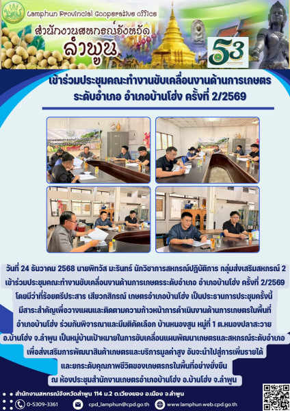 วันที่ 24 ธันวาคม 2568 นายพิทวัส มะรินทร์ นักวิชาการสหกรณ์ปฏิบัติการ กลุ่มส่งเสริมสหกรณ์ 2 เข้าร่วมประชุมคณะทำงานขับเคลื่อนงานด้านการเกษตรระดับอำเภอ อำเภอบ้านโฮ่ง ครั้งที่ 2/2569 โดยมีว่าที่ร้อยตรีประสาร เสียวกสิกรณ์ เกษตรอำเภอบ้านโฮ่ง เป็นประธานการประชุมครั้งนี้ มีสาระสำคัญเพื่อวางแผนและติดตามความก้าวหน้าการดำเนินงานด้านการเกษตรในพื้นที่อำเภอบ้านโฮ่ง ร่วมกันพิจารณาและมีมติคัดเลือก บ้านหนองสูน หมู่ที่ 1 ต.หนองปลาสะวาย อ.บ้านโฮ่ง จ.ลำพูน เป็นหมู่บ้านเป้าหมายในการขับเคลื่อนแผนพัฒนาเกษตรและสหกรณ์ระดับอำเภอ เพื่อส่งเสริมการพัฒนาสินค้าเกษตรและบริการมูลค่าสูง อันจะนำไปสู่การเพิ่มรายได้และยกระดับคุณภาพชีวิตของเกษตรกรในพื้นที่อย่างยั่งยืน ณ ห้องประชุมสำนักงานเกษตรอำเภอบ้านโฮ่ง อ.บ้านโฮ่ง จ.ลำพูน