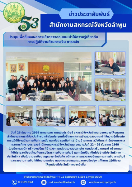 วันที่ 26 ธันวาคม 2568 นายจณภพ กาญจนประดิษฐ์ สหกรณ์จังหวัดลำพูน มอบหมายให้บุคลากรสำนักงานสหกรณ์จังหวัดลำพูน เข้าร่วมประชุมเพื่อชี้แจงผลการเข้าตรวจสอบแนะนำให้ความรู้เกี่ยวกับการปฏิบัติงานด้านการเงิน การคลัง และพัสดุ รวมถึงค่าเช่าบ้านข้าราชการ สวัสดิการ ค่ารักษาพยาบาล และการศึกษาบุตร ของสำนักงานสหกรณ์จังหวัดลำพูน ระหว่างวันที่ 22 – 26 ธันวาคม 2568 โดยมีนายสมนึก ศรีผดุงเจริญ ผู้อำนวยการกลุ่มตรวจสอบภายใน กรมส่งเสริมสหกรณ์ พร้อมคณะได้ให้รายละเอียดเกี่ยวกับการบริหารการเงิน การบัญชี และทรัพย์สิน เป็นไปอย่างมีประสิทธิภาพ ประสิทธิผล เป็นไปตามระเบียบ กฎหมาย ข้อบังคับ มติครม. การตรวจสอบข้อมูลทางการเงิน การบัญชี และรายงานการเงิน ให้มีความถูกต้อง ตลอดจนเสนอแนะแนวทางปรับปรุง แก้ไขการปฏิบัติงานให้ถูกต้องมีประสิทธิภาพมากยิ่งขึ้น