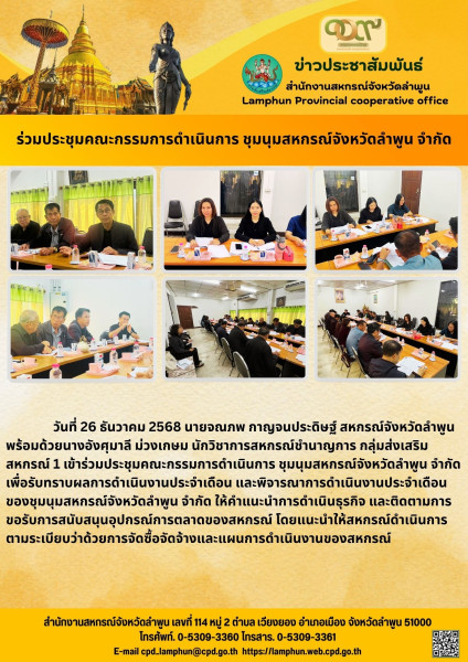 วันที่ 26 ธันวาคม 2568 นายจณภพ กาญจนประดิษฐ์ สหกรณ์จังหวัดลำพูน พร้อมด้วยนางอังศุมาลี ม่วงเกษม นักวิชาการสหกรณ์ชำนาญการ กลุ่มส่งเสริมสหกรณ์ 1 เข้าร่วมประชุมคณะกรรมการดำเนินการ ชุมนุมสหกรณ์จังหวัดลำพูน จำกัด เพื่อรับทราบผลการดำเนินงานประจำเดือน และพิจารณาการดำเนินงานประจำเดือนของชุมนุมสหกรณ์จังหวัดลำพูน จำกัด ให้คำแนะนำการดำเนินธุรกิจ และติดตามการขอรับการสนับสนุนอุปกรณ์การตลาดของสหกรณ์ โดยแนะนำให้สหกรณ์ดำเนินการตามระเบียบว่าด้วยการจัดซื้อจัดจ้างและแผนการดำเนินงานของสหกรณ์