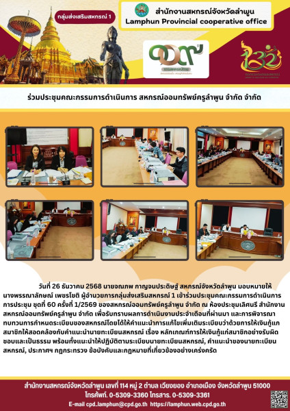 วันที่ 26 ธันวาคม 2568 นายจณภพ กาญจนประดิษฐ์ สหกรณ์จังหวัดลำพูน มอบหมายให้นางพรรณาลักษณ์ เพชรโชติ ผู้อำนวยการกลุ่มส่งเสริมสหกรณ์ 1 เข้าร่วมประชุมคณะกรรมการดำเนินการ การประชุม ชุดที่ 60 ครั้งที่ 1/2569 ของสหกรณ์ออมทรัพย์ครูลำพูน จำกัด ณ ห้องประชุมเลิศนรี สำนักงานสหกรณ์ออมทรัพย์ครูลำพูน จำกัด เพื่อรับทราบผลการดำเนินงานประจำเดือนที่ผ่านมา และการพิจารณาทบทวนการกำหนดระเบียบของสหกรณ์โดยได้ให้คำแนะนำการแก้ไขเพิ่มเติมระเบียบว่าด้วยการให้เงินกู้แกสมาชิกให้สอดคล้องกับคำแนะนำนายทะเบียนสหกรณ์ เรื่อง หลักเกณฑ์การให้เงินกู้แก่สมาชิกอย่างรับผิดชอบและเป็นธรรม พร้อมทั้งแนะนำให้ปฏิบัติตามระเบียบนายทะเบียนสหกรณ์, คำแนะนำของนายทะเบียนสหกรณ์, ประกาศฯ กฎกระทรวง ข้อบังคับและกฎหมายที่เกี่ยวข้องอย่างเคร่งครัด