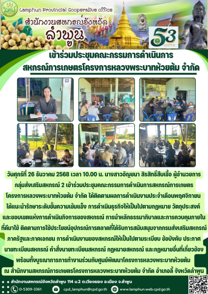 วันที่ 26 ธันวาคม 2568 นางสาวอัญชนา สิรสิทธิ์สืบเชื้อ ผู้อำนวยการกลุ่มส่งเสริมสหกรณ์ 2 เข้าร่วมประชุมคณะกรรมการดำเนินการสหกรณ์การเกษตรโครงการหลวงพระบาทห้วยต้ม จำกัด ได้ติดตามผลการดำเนินงานประจำเดือนพฤศจิกายน ได้แนะนำรักษาระดับชั้นความเข้มแข็ง การดำเนินธุรกิจให้เป็นไปตามกฎหมาย วัตถุประสงค์ และขอบเขตแห่งการดำเนินกิจการของสหกรณ์ การนำหลักธรรมาภิบาลและการควบคุมภายในที่ดีมาใข้ ติดตามการใช้ประโยชน์อุปกรณ์การตลาดที่ได้รับการสนับสนุนจากกรมส่งเสริมสหกรณ์ ภาครัฐและภาคเอกชน การดำเนินงานของสหกรณ์ให้เป็นไปตามระเบียบ ข้อบังคับ ประกาศนายทะเบียนสหกรณ์ คำสั่งนายทะเบียนสหกรณ์ กฎหมายสหกรณ์ และกฎหมายอื่นที่เกี่ยวข้อง พร้อมทั้งบูรณาการการทำงานร่วมกับศูนย์พัฒนาโครงการหลวงพระบาทห้วยต้ม ณ สำนักงานสหกรณ์การเกษตรโครงการหลวงพระบาทห้วยต้ม จำกัด อำเภอลี้ จังหวัดลำพูน