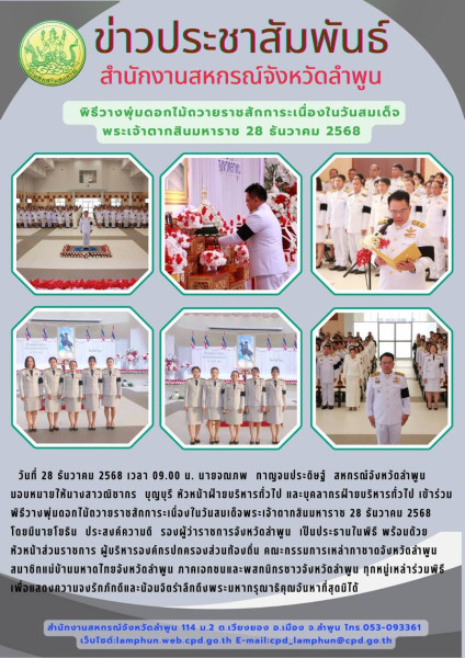 วันที่ 28 ธันวาคม 2568 เวลา09.00 น. นายจณภพ กาญจนประดิษฐ์ สหกรณ์จังหวัดลำพูน มอบหมายให้นางสาวณิชากร บุญบุรี หัวหน้าฝ่ายบริหารทั่วไป ร่วมพิธีวางพุ่มดอกไม้ถวายราชสักการะเนื่องในวันสมเด็จพระเจ้าตากสินมหาราช 28 ธันวาคม 2568 โดยมีนายโยธิน ประสงค์ความดี รองผู้ว่าราชการจังหวัดลำพูน เป็นประธานในพิธี พร้อมด้วย ผู้พิพากษาหัวหน้าศาล ทหาร ตำรวจ หัวหน้าส่วนราชการ ผู้บริหารองค์กรปกครองส่วนท้องถิ่น คณะกรรมการเหล่ากาชาดจังหวัดลำพูน สมาชิกแม่บ้านมหาดไทยจังหวัดลำพูน ภาคเอกชนและพสกนิกรชาวจังหวัดลำพูน ทุกหมู่เหล่าร่วมพิธี เพื่อแสดงความจงรักภักดีและน้อมจิตรำลึกถึงพระมหากรุณาธิคุณอันหาที่สุดมิได้