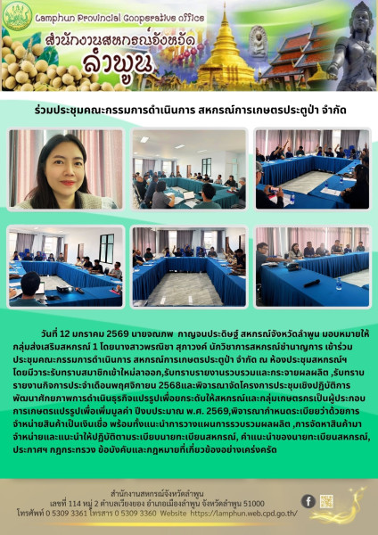 วันที่ 12 มกราคม 2569 นายจณภพ กาญจนประดิษฐ์ สหกรณ์จังหวัดลำพูน มอบหมายให้ กลุ่มส่งเสริมสหกรณ์ 1 โดยนางสาวพรณิชา สุภาวงค์ นักวิชาการสหกรณ์ชำนาญการ เข้าร่วมประชุมคณะกรรมการดำเนินการ สหกรณ์การเกษตรประตูป่า จำกัด ณ ห้องประชุมสหกรณ์ฯ โดยมีวาระรับทราบสมาชิกเข้าใหม่ลาออก,รับทราบรายงานรวบรวมและกระจายผลผลิต ,รับทราบรายงานกิจการประจำเดือนพฤศจิกายน 2568และพิจารณาจัดโครงการประชุมเชิงปฏิบัติการพัฒนาศักยภาพการดำเนินธุรกิจแปรรูปเพื่อยกระดับให้สหกรณ์และกลุ่มเกษตรกรเป็นผู้ประกอบการเกษตรแปรรูปเพื่อเพิ่มมูลค่า ปีงบประมาณ พ.ศ. 2569,พิจารณากำหนดระเบียยว่าด้วยการจำหน่ายสินค้าเป็นเงินเชื่อ พร้อมทั้งแนะนำการวางแผนการรวบรวมผลผลิต ,การจัดหาสินค้ามาจำหน่ายและแนะนำให้ปฏิบัติตามระเบียบนายทะเบียนสหกรณ์, คำแนะนำของนายทะเบียนสหกรณ์, ประกาศฯ กฎกระทรวง ข้อบังคับและกฎหมายที่เกี่ยวข้องอย่างเคร่งครัด