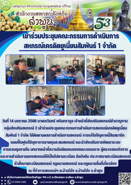 วันที่ 14 มกราคม 2569 นายเฑวินทร์ พรินทรากูล เจ้าหน้าที่ส่งเสริมสหกรณ์ชำนาญงาน กลุ่มส่งเสริมสหกรณ์ 2 เข้าร่วมประชุมคณะกรรมการดำเนินการสหกรณ์เครดิตยูเนี่ยนสัมพันธ์ 1 จำกัด ได้ติดตามผลการดำเนินงานสหกรณ์ การแก้ไขปัญหาหนี้สินสมาชิก แผนฟื้นฟูแก้ปัญหาการขาดทุนสะสมสหกรณ์ แนะนำส่งเสริมการพัฒนาระบบการควบคุมภายใน บทบาทหน้าที่ความรับผิดชอบของคณะกรรมการ ผู้ตรวจสอบกิจการ และการดำเนินงานของสหกรณ์ให้เป็นไปตามระเบียบ ข้อบังคับ ประกาศนายทะเบียนสหกรณ์ คำสั่งนายทะเบียนสหกรณ์ กฎหมายสหกรณ์ และกฎหมายอื่นที่เกี่ยวข้อง ณ ที่ทำการสหกรณ์ฯ ต.บ้านโฮ่ง อ.บ้านโฮ่ง จ.ลำพูน