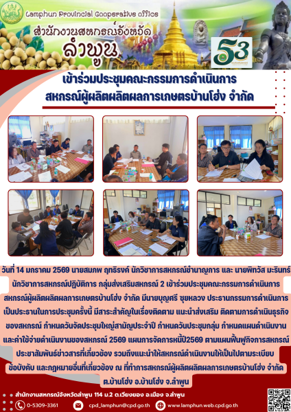วันที่ 14 มกราคม 2569 นายสมภพ ฤทธิรงค์ นักวิชาการสหกรณ์ชำนาญการ และ นายพิทวัส มะรินทร์ นักวิชาการสหกรณ์ปฏิบัติการ กลุ่มส่งเสริมสหกรณ์ 2 เข้าร่วมประชุมคณะกรรมการดำเนินการสหกรณ์ผู้ผลิตผลิตผลการเกษตรบ้านโฮ่ง จำกัด มีนายบุญศรี ซุยหลวง ประธานกรรมการดำเนินการเป็นประธานในการประชุมครั้งนี้ มีสาระสำคัญในเรื่องแนะนำส่งเสริม ติดตามการดำเนินธุรกิจของสหกรณ์ กำหนดวันจัดประชุมใหญ่สามัญประจำปี กำหนดวันประชุมกลุ่ม กำหนดแผนดำเนินงานและค่าใช้จ่ายดำเนินงานของสหกรณ์ 2569 แผนการจัดการหนี้ปี2569 ตามแผนฟื้นฟูกิจการสหกรณ์ ประชาสัมพันธ์ข่าวสารที่เกี่ยวข้อง รวมถึงแนะนำให้สหกรณ์ดำเนินงานให้เป็นไปตามระเบียบ ข้อบังคับ และกฎหมายอื่นที่เกี่ยวข้อง ณ ที่ทำการสหกรณ์ผู้ผลิตผลิตผลการเกษตรบ้านโฮ่ง จำกัด ต.บ้านโฮ่ง อ.บ้านโฮ่ง จ.ลำพูน