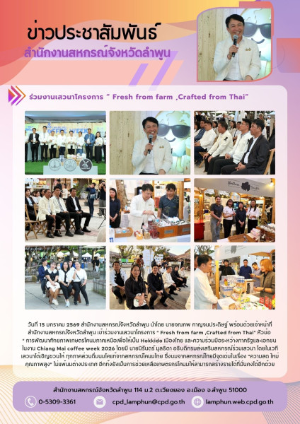 วันที่ 15 มกราคม 2569 สำนักงานสหกรณ์จังหวัดลำพูน นำโดย นายจณภพ กาญจนประดิษฐ์ พร้อมด้วยเจ้าหน้าที่สำนักงานสหกรณ์จังหวัดลำพูน เข้าร่วมงานเสวนาโครงการ “ Fresh from farm ,Crafted from Thai” หัวข้อ “ การพัฒนาศักยภาพเกษตรโคนมภาคเหนือเพื่อให้เป็น Hokkido เมืองไทย และความร่วมมือระหว่างภาครัฐและเอกชน ในงาน Chiang Mai coffee week 2026 โดยมี นายนิรันดร์ มูลธิดา อธิบดีกรมส่งเสริมสหกรณ์ร่วมเสวนา โดยในเวทีเสวนาได้เชิญชวนให้ ทุกภาคส่วนดื่มนมโคแท้จากสหกรณ์โคนมไทย ซึ่งนมจากสหกรณ์ไทยมีจุดเด่นในเรื่อง “ความสด ใหม่ คุณภาพสูง” ไม่แพ้นมต่างประเทศ อีกท้้งยังเป็นการช่วยเหลือเกษตรกรโคนมให้สามารถสร้างรายได้ที่มั่นคงได้อีกด้วย
