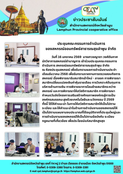 วันที่ 16 มกราคม 2569 นางสาวชญาดา วงศ์ตันกาศ นักวิชาการสหกรณ์ชำนาญการ เข้าร่วมประชุมคณะกรรมการดำเนินการ สหกรณ์ออมทรัพย์สาธารณสุขลำพูน จำกัด ณ ห้องประชุมสหกรณ์ เพื่อรับทราบผลการดำเนินงานประจำเดือนธันวาคม 2568 เพื่อรับทราบรายงานการตรวจสอบกิจการสหกรณ์ เรื่องพิจารณารับสมาชิกเข้าใหม่ - ลาออก การพิจารณาสมาชิกเปลี่ยนแปลงเงินค่าหุ้นรายเดือน การวิเคราะห์ต้นทุนการบริหารด้านการเงิน การพิจารณาการโอนย้ายสมาชิกระหว่างสหกรณ์ และการพิจารณาให้สวัสดิการสมาชิก การพิจารณากำหนดวันจัดโครงการเสริมสร้างศักยภาพองค์กรสู่การเป็นองค์กรสมรรถนะสูงด้วยเทคโนโลยีและนวัตกรรม ปี 2569 ทั้งนี้ ได้ให้คำแนะนำ ในการให้สวัสดิการสมาชิกให้เป็นไปตามระเบียบ และให้คำแนะนำในด้านการดำเนินงานของสหกรณ์ให้เป็นไปตามแผนงานงบประมาณที่ได้อนุมัติจากที่ประชุมใหญ่และการดำเนินงานของสหกรณ์ให้เป็นไปตามข้อบังคับ ระเบียบ กฎหมายที่เกี่ยวข้อง เพื่อประโยชน์แก่สมาชิกสูงสุด