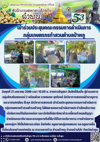 วันที่ 21 มกราคม 2569 เวลา 10.00 น. นางสาวอัญชนา สิรสิทธิ์สืบเชื้อ ผู้อำนวยการกลุ่มส่งเสริมสหกรณ์ 2 พร้อมด้วย นายสมภพ ฤทธิรงค์ นักวิชาการสหกรณ์ชำนาญการ และ นางแสงเดือน ต๊ะดุก นักวิชาการสหกรณ์ เข้าร่วมประชุมคณะกรรมการดำเนินการกลุ่มเกษตรกรทำสวนตำบลป่าพลู ได้ติดตามผลการดำเนินงานประจำเดือนธันวาคม เร่งรัดการแก้ไขข้อบกพร่อง และเร่งรัดให้สมาชิกมาชำระหนี้ตามกำหนดสัญญา นำหลักธรรมาภิบาลและควบคุมภายในที่ดีมาใช้ในการบริหารงาน การดำเนินงานของกลุ่มฯ ให้เป็นไปตามระเบียบ ข้อบังคับ กฎหมายกลุ่มเกษตรกร และกฎหมายอื่นที่เกี่ยวข้องอย่างเคร่งครัด ณ ศาลากลางบ้าน ตำบลป่าพลู อำเภอบ้านโฮ่ง จังหวัดลำพูน