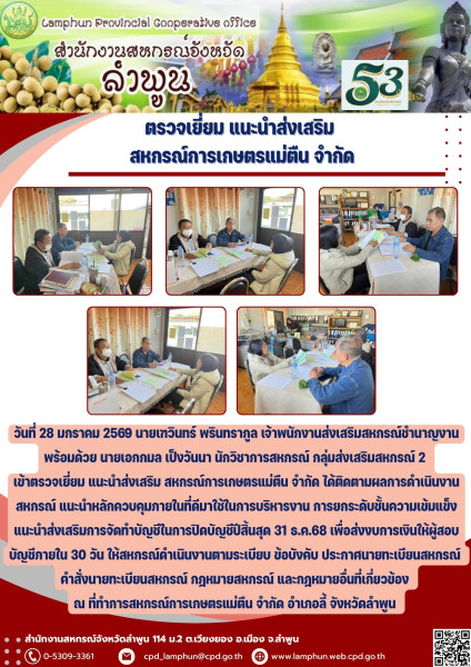 วันที่ 28 มกราคม 2569 นายเฑวินทร์ พรินทรากูล เจ้าพนักงานส่งเสริมสหกรณ์ชำนาญงาน พร้อมด้วย นายเอกกมล เป็งวันนา นักวิชาการสหกรณ์ กลุ่มส่งเสริมสหกรณ์ 2 เข้าตรวจเยี่ยม แนะนำส่งเสริม สหกรณ์การเกษตรแม่ตืน จำกัด ได้ติดตามผลการดำเนินงานสหกรณ์ แนะนำหลักควบคุมภายในที่ดีมาใช้ในการบริหารงาน การยกระดับชั้นความเข้มแข็ง แนะนำส่งเสริมการจัดทำบัญชีในการปิดบัญชีปีสิ้นสุด 31 ธ.ค.68 เพื่อส่งงบการเงินให้ผู้สอบบัญชีภายใน 30 วัน ให้สหกรณ์ดำเนินงานตามระเบียบ ข้อบังคับ ประกาศนายทะเบียนสหกรณ์ คำสั่งนายทะเบียนสหกรณ์ กฎหมายสหกรณ์ และกฎหมายอื่นที่เกี่ยวข้อง ณ ที่ทำการสหกรณ์การเกษตรแม่ตืน จำกัด อำเภอลี้ จังหวัดลำพูน