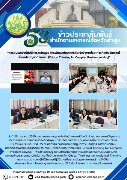 วันที่ 29 มกราคม 2569 นายจณภพ กาญจนประดิษฐ์ สหกรณ์จังหวัดลำพูน มอบหมายให้บุคลากรสำนักงานสหกรณ์จังหวัดลำพูน เข้าร่วมโครงการพัฒนาบุคลากรเพื่อยกระดับการบริการ ประจำปีงบประมาณ พ.ศ.2569 กิจกรรม "การอบรมเชิงปฏิบัติการ หลักสูตร การพัฒนาทักษะการคิดเชิงวิพากษ์และการคิดเชิงวิเคราะห์ เพื่อแก้ไขปัญหาที่ซับซ้อน (Critical Thinking for Complex Problem solving)" เพื่อสร้างความรู้ ความเข้าใจให้แก่บุคคลของกรมเกี่ยวกับระบบความคิดและการพัฒนาระบบความคิดในการแก้ไขปัญหาตามหลัก Critical Thinking และ Analytical Thinking และสามารถนำความรู้ไปใช้ในการปฏิบัติงานเพื่อยกระดับคุณภาพการบริการให้ดีขึ้น ผ่านระบบ Zoom meeting จากห้องประชุม 226 ชั้น 2 อาคาร 1 กรมส่งเสริมสหกรณ์ข้าราชการ