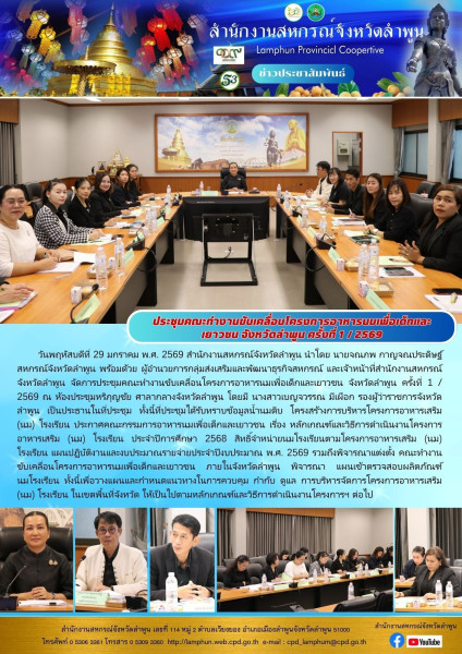 วันที่ 29 มกราคม พ.ศ. 2569 สำนักงานสหกรณ์จังหวัดลำพูน นำโดย นายจณภพ กาญจณประดิษฐ์ สหกรณ์จังหวัดลำพูน พร้อมด้วย ผู้อำนวยการกลุ่มส่งเสริมและพัฒนาธุรกิจสหกรณ์ และเจ้าหน้าที่สำนักงานสหกรณ์จังหวัดลำพูน จัดการประชุมคณะทำงานขับเคลื่อนโครงการอาหารนมเพื่อเด็กและเยาวชน จังหวัดลำพูน ครั้งที่ 1 / 2569 ณ ห้องประชุมหริภุญชัย ศาลากลางจังหวัดลำพูน โดยมี นางสาวเบญจวรรณ มีเผือก รองผู้ว่าราชการจังหวัดลำพูน เป็นประธานในที่ประชุม ทั้งนี้ที่ประชุมได้รับทราบข้อมูลน้ำนมดิบ โครงสร้างการบริหารโครงการอาหารเสริม (นม) โรงเรียน ประกาศคณะกรรมการอาหารนมเพื่อเด็กและเยาวชน เรื่อง หลักเกณฑ์และวิธีการดำเนินงานโครงการอาหารเสริม (นม) โรงเรียน ประจำปีการศึกษา 2568 สิทธิ์จำหน่ายนมโรงเรียนตามโครงการอาหารเสริม (นม) โรงเรียน แผนปฏิบัติงานและงบประมาณรายจ่ายประจำปีงบประมาณ พ.ศ. 2569 รวมถึงพิจารณาแต่งตั้ง คณะทำงานขับเคลื่อนโครงการอาหารนมเพื่อเด็กและเยาวชน ภายในจังหวัดลำพูน พิจารณา แผนเข้าตรวจสอบผลิตภัณฑ์นมโรงเรียน ทั้งนี้เพื่อวางแผนและกำหนดแนวทางในการควบคุม กำกับ ดูแล การบริหารจัดการโครงการอาหารเสริม (นม) โรงเรียน ในเขตพื้นที่จังหวัด ให้เป็นไปตามหลักเกณฑ์และวิธีการดำเนินงานโครงการฯ ต่อไป