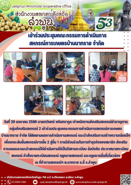 วันที่ 29 มกราคม 2569 นายเฑวินทร์ พรินทรากูล เจ้าพนักงานส่งเสริมสหกรณ์ชำนาญงาน กลุ่มส่งเสริมสหกรณ์ 2 เข้าร่วมประชุมคณะกรรมการดำเนินการสหกรณ์การเกษตรบ้านนาทราย จำกัด ได้ติดตามผลการดำเนินงานสหกรณ์ แนะนำส่งเสริมการสร้างความเข้มแข็งเพื่อยกระดับชั้นสหกรณ์จากชั้น 2 สู่ชั้น 1 การมีส่วนร่วมในการทำธุรกิจของสมาชิก ส่งเสริมการออมและแนะนำสหกรณ์ให้ดำเนินงานให้เป็นไปตามระเบียบ ข้อบังคับ ประกาศนายทะเบียนสหกรณ์ คำสั่งนายทะเบียนสหกรณ์ กฎหมายสหกรณ์ และกฎหมายอื่นที่เกี่ยวข้อง ณ ที่ทำการสหกรณ์ฯ ต.นาทราย อ.ลี้ จ.ลำพูน