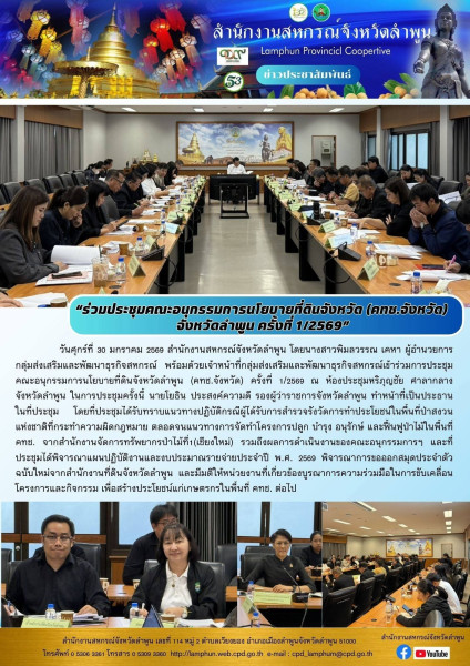 วันที่ 30 มกราคม 2569 สำนักงานสหกรณ์จังหวัดลำพูน โดยนางสาวพิมลวรรณ เคหา ผู้อำนวยการ กลุ่มส่งเสริมและพัฒนาธุรกิจสหกรณ์ พร้อมด้วยเจ้าหน้าที่กลุ่มส่งเสริมและพัฒนาธุรกิจสหกรณ์เข้าร่วมการประชุมคณะอนุกรรมการนโยบายที่ดินจังหวัดลำพูน (คทช.จังหวัด) ครั้งที่ 1/2569 ณ ห้องประชุมหริภุญชัย ศาลากลางจังหวัดลำพูน ในการประชุมครั้งนี้ นายโยธิน ประสงค์ความดี รองผู้ว่าราชการจังหวัดลำพูน ทำหน้าที่เป็นประธานในที่ประชุม โดยที่ประชุมได้รับทราบแนวทางปฏิบัติกรณีผู้ได้รับการสำรวจรังวัดการทำประโยชน์ในพื้นที่ป่าสงวนแห่งชาติที่กระทำความผิดกฎหมาย ตลอดจนแนวทางการจัดทำโครงการปลูก บำรุง อนุรักษ์ และฟื้นฟูป่าไม้ในพื้นที่ คทช. จากสำนักงานจัดการทรัพยากรป่าไม้ที่1(เชียงใหม่) รวมถึงผลการดำเนินงานของคณะอนุกรรมการฯ และที่ ประชุมได้พิจารณาแผนปฏิบัติงานและงบประมาณรายจ่ายประจำปี พ.ศ. 2569 พิจารณาการขอออกสมุดประจำตัวฉบับใหม่จากสำนักงานที่ดินจังหวัดลำพูน และมีมติให้หน่วยงานที่เกี่ยวข้องบูรณาการความร่วมมือในการขับเคลื่อนโครงการและกิจกรรม เพื่อสร้างประโยชน์แก่เกษตรกรในพื้นที่ คทช. ต่อไป