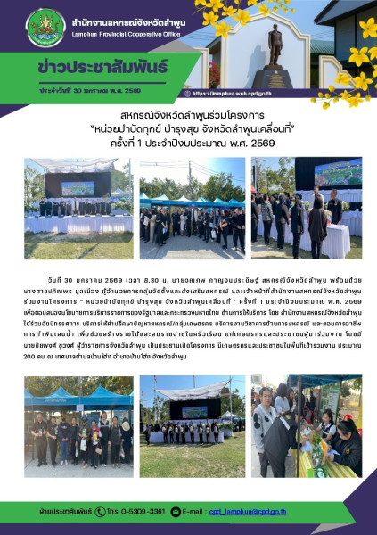 วันที่ 30 มกราคม 2569 เวลา 8.30 น. นายจณภพ กาญจนประดิษฐ์ สหกรณ์จังหวัดลำพูน พร้อมด้วย นางสาวปภิณพร มูลเมือง ผู้อำนวยการกลุ่มจัดตั้งและส่งเสริมสหกรณ์ และเจ้าหน้าที่สำนักงานสหกรณ์จังหวัดลำพูน ร่วมงานโครงการ “ หน่วยบำบัดทุกข์ บำรุงสุข จังหวัดลำพูนเคลื่อนที่ ” ครั้งที่ 1 ประจำปีงบประมาณ พ.ศ. 2569 เพื่อตอบสนองนโยบายการบริหารราชการของรัฐบาลและกระทรวงมหาดไทย ด้านการให้บริการ โดย สำนักงานสหกรณ์จังหวัดลำพูน ได้ร่วมจัดนิทรรศการ บริการให้คำปรึกษาปัญหาสหกรณ์/กลุ่มเกษตรกร บริการงานวิชาการด้านการสหกรณ์ และสอนการอาชีพการทำพิมเสนน้ำ เพื่อช่วยสร้างรายได้และลดรายจ่ายในครัวเรือน แก่เกษตรกรและประชาชนผู้มาร่วมงาน โดยมีนายปิยพงศ์ ชูวงศ์ ผู้ว่าราชการจังหวัดลำพูน เป็นประธานเปิดโครงการ มีเกษตรกรและประชาชนในพื้นที่เข้าร่วมงาน ประมาณ 200 คน ณ เทศบาลตำบลบ้านโฮ่ง อำเภอบ้านโฮ่ง จังหวัดลำพูน