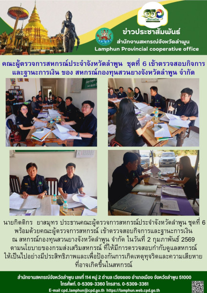 นายกิตติกร ยาสมุทร ประธานคณะผู้ตรวจการสหกรณ์ประจำจังหวัดลำพูน ชุดที่ 6 พร้อมด้วยคณะผู้ตรวจการสหกรณ์ เข้าตรวจสอบกิจการและฐานะการเงิน ณ สหกรณ์กองทุนสวนยางจังหวัดลำพูน จำกัด ในวันที่ 2 กุมภาพันธ์ 2569 ตามนโยบายของกรมส่งเสริมสหกรณ์ ที่ให้มีการตรวจสอบกำกับดูแลสหกรณ์ ให้เป็นไปอย่างมีประสิทธิภาพและเพื่อป้องกันการเกิดเหตุทุจริตและความเสียหายที่อาจเกิดขึ้นในสหกรณ์
