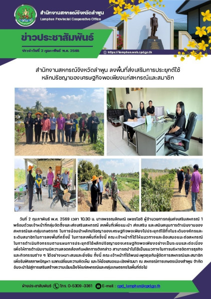 วันที่ 2 กุมภาพันธ์ พ.ศ. 2569 เวลา 10.30 น. นางพรรณลักษณ์ เพชรโชติ ผู้อำนวยการกลุ่มส่งเสริมสหกรณ์ 1 พร้อมด้วยเจ้าหน้าที่กลุ่มจัดตั้งและส่งเสริมสหกรณ์ ลงพื้นที่เพื่อแนะนำ ส่งเสริม และสนับสนุนการดำเนินงานของสหกรณ์และกลุ่มเกษตรกร ในการน้อมนำหลักปรัชญาของเศรษฐกิจพอเพียงไปประยุกต์ใช้ทั้งในระดับองค์กรและ ระดับสมาชิกในการลงพื้นที่ครั้งนี้ ในการลงพื้นที่ครั้งนี้ คณะเจ้าหน้าที่ได้ให้แนวทางและข้อเสนอแนะต่อสหกรณ์ในการดำเนินกิจกรรมตามแผนการประยุกต์ใช้หลักปรัชญาของเศรษฐกิจพอเพียงอย่างเป็นระบบและต่อเนื่องเพื่อให้การดำเนินงานมีความสอดคล้องกับหลักการดังกล่าว สามารถนำไปใช้เป็นแนวทางในการบริหารจัดการธุรกิจและกิจกรรมต่าง ๆ ได้อย่างเหมาะสมและยั่งยืน ทั้งนี้ คณะเจ้าหน้าที่ได้พบปะพูดคุยกับผู้จัดการสหกรณ์และสมาชิก เพื่อรับฟังสภาพปัญหา แลกเปลี่ยนความคิดเห็น และให้ข้อเสนอแนะเชิงพัฒนา ณ สหกรณ์การเกษตรเมืองลำพูน จำกัด อันจะนำไปสู่การเสริมสร้างความเข้มแข็งให้แก่สหกรณ์และกลุ่มเกษตรกรในพื้นที่ต่อไป