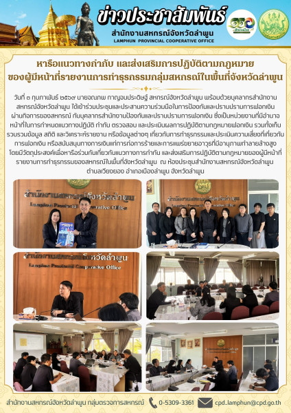 วันที่ 3 กุมภาพันธ์ 2569 นายจณภพ กาญจนประดิษฐ์ สหกรณ์จังหวัดลำพูน พร้อมด้วยบุคลากร สำนักงาน สหกรณ์จังหวัดลำพูน ได้เข้าร่วมประชุมและประสานความร่วมมือ ในการป้องกันและปราบปรามการฟอกเงินผ่านกิจการของสหกรณ์ กับบุคลากรสำนักงานป้องกันและปราบปรามการฟอกเงิน ซึ่งเป็นหน่วยงานที่มีอำนาจหน้าที่ในการกำหนดแนวทางปฏิบัติ กำกับ ตรวจสอบ และประเมินผลการปฏิบัติ ตามกฎหมายฟอกเงิน รวมทั้งเก็บรวบรวมข้อมูล สถิติ และวิเคราะห์รายงาน หรือข้อมูลต่างๆ เกี่ยวกับการทำธุรกรรมและประเมินความเสี่ยงที่เกี่ยวกับการฟอกเงิน หรือสนับสนุนทางการเงินแก่การก่อการร้ายและการแพร่ขยายอาวุธที่มีอานุภาพทำลายล้างสูงโดยมีวัตถุประสงค์เพื่อหารือร่วมกันเกี่ยวกับแนวทางการกำกับและส่งเสริมการปฏิบัติตามกฎหมายของผู้มีหน้าที่รายงานการทำธุรกรรมของสหกรณ์ในพื้นที่จังหวัดลำพูน ณ ห้องประชุมสำนักงานสหกรณ์จังหวัดลำพูน ตำบลเวียงยอง อำเภอเมืองลำพูน จังหวัดลำพูน