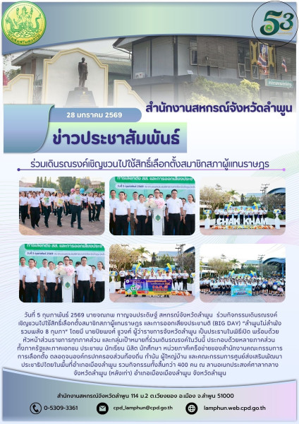 วันที่ 5 กุมภาพันธ์ 2569 นายจณภพ กาญจนประดิษฐ์ สหกรณ์จังหวัดลำพูน ร่วมกิจกรรมเดินรณรงค์เชิญชวนไปใช้สิทธิ์เลือกตั้งสมาชิกสภาผู้แทนราษฎร และการออกเสียงประชามติ (BIG DAY) “ลำพูนไม่ลำพัง รวมพลัง 8 กุมภา” โดยมี นายปิยพงศ์ ชูวงศ์ ผู้ว่าราชการจังหวัดลำพูน เป็นประธานในพิธีเปิด พร้อมด้วยหัวหน้าส่วนราชการทุกภาคส่วน และกลุ่มเป้าหมายที่ร่วมเดินรณรงค์ในวันนี้ ประกอบด้วยหลายภาคส่วน ทั้งภาครัฐและภาคเอกชน ประชาชน นักเรียน นิสิต นักศึกษา หน่วยภาคีเครือข่ายของสำนักงานคณะกรรมการการเลือกตั้ง ตลอดจนองค์กรปกครองส่วนท้องถิ่น กำนัน ผู้ใหญ่บ้าน และคณะกรรมการศูนย์ส่งเสริมพัฒนาประชาธิปไตยในพื้นที่อำเภอเมืองลำพูน รวมกิจกรรมทั้งสิ้นกว่า 400 คน ณ ลานอเนกประสงค์ศาลากลางจังหวัดลำพูน (หลังเก่า) อำเภอเมืองเมืองลำพูน จังหวัดลำพูน