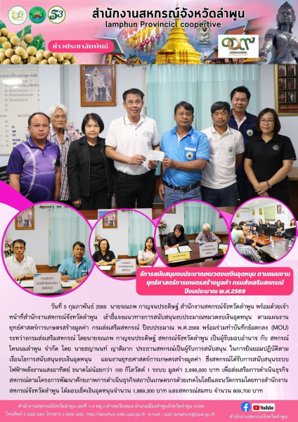 วันที่ 5 กุมภาพันธ์ 2569 นายจณภพ กาญจนประดิษฐ์ สำนักงานสหกรณ์จังหวัดลำพูน พร้อมด้วยเจ้าหน้าที่สำนักงานสหกรณ์จังหวัดลำพูน เข้าชี้แจงแนวทางการสนับสนุนงบประมาณหมวดงบเงินอุดหนุน ตามแผนงานยุทธ์ศาสตร์การเกษตรสร้างมูลค่า กรมส่งเสริมสหกรณ์ ปีงบประมาณ พ.ศ.2569 พร้อมร่วมทำบันทึกข้อตกลง (MOU) ระหว่างกรมส่งเสริมสหกรณ์ โดยนายจณภพ กาญจนประดิษฐ์ สหกรณ์จังหวัดลำพูน เป็นผู้รับมอบอำนาจ กับ สหกรณ์โคนนมลำพูน จำกัด โดย นายชญานนท์ ญาติมาก ประธานสหกรณ์เป็นผู้รับการสนับสนุน ในการยินยอมปฏิบัติตามเงื่อนไขการสนับสนุนงบเงินอุดหนุน แผนงานยุทธศาสตร์การเกษตรสร้างมูลค่า ซึ่งสหกรณ์ได้รับการสนับสนุนระบบไฟฟ้าพลังงานแสงอาทิตย์ ขนาดไม่น้อยกว่า 100 กิโลวัตต์ 1 ระบบ มูลค่า 2,699,000 บาท เพื่อส่งเสริมการดำเนินธุรกิจสหกรณ์ตามโครงการพัฒนาศักยภาพการดำเนินธุรกิจสถาบันเกษตรกรด้วยเทคโนโลยีและนวัตกรรมโดยทางสำนักงานสหกรณ์จังหวัดลำพูน ได้มอบเช็คเงินอุดหนุนจำนวน 1,889,300 บาท และสหกรณ์สมทบ จำนวน 809,700 บาท