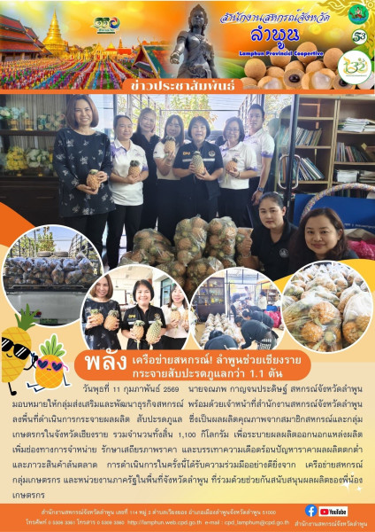 วันที่ 11 กุมภาพันธ์ 2569 นายจณภพ กาญจนประดิษฐ์ สหกรณ์จังหวัดลำพูน มอบหมายให้กลุ่มส่งเสริมและพัฒนาธุรกิจสหกรณ์ พร้อมด้วยเจ้าหน้าที่สำนักงานสหกรณ์จังหวัดลำพูน ลงพื้นที่ดำเนินการกระจายผลผลิต สับปะรดภูแล ซึ่งเป็นผลผลิตคุณภาพจากสมาชิกสหกรณ์และกลุ่มเกษตรกรในจังหวัดเชียงราย รวมจำนวนทั้งสิ้น 1,100 กิโลกรัม เพื่อระบายผลผลิตออกนอกแหล่งผลิต เพิ่มช่องทางการจำหน่าย รักษาเสถียรภาพราคา และบรรเทาความเดือดร้อนปัญหาราคาผลผลิตตกต่ำและภาวะสินค้าล้นตลาด การดำเนินการในครั้งนี้ได้รับความร่วมมืออย่างดียิ่งจาก เครือข่ายสหกรณ์ กลุ่มเกษตรกร และหน่วยงานภาครัฐในพื้นที่จังหวัดลำพูน ที่ร่วมด้วยช่วยกันสนับสนุนผลผลิตของพี่น้องเกษตรกร