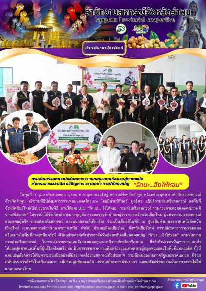 วันที่ 11 กุมภาพันธ์ 2569 นายจณภพ กาญจนประดิษฐ์ สหกรณ์จังหวัดลำพูน พร้อมด้วยบุคลากรสำนักงานสหกรณ์จังหวัดลำพูน เข้าร่วมพิธีปล่อยคาราวานหอมแดงศรีสะเกษ โดยมีนายนิรันดร์ มูลธิดา อธิบดีกรมส่งเสริมสหกรณ์ ลงพื้นที่จังหวัดเชียงใหม่เป็นประธานในพิธี ภายใต้แคมเปญ “รักนะ....จึงให้หอม กรมส่งเสริมสหกรณ์ ร่วมกระจายหอมแดงคุณภาพดีจากศรีสะเกษ” ในการนี้ ได้รับเกียรติจากนายบุญลือ ธรรมธรานุรักษ์ รองผู้ว่าราชการจังหวัดเชียงใหม่ ผู้แทนขบวนการสหกรณ์ ตลอดจนผู้บริหารกรมส่งเสริมสหกรณ์ และหน่วยงานที่เกี่ยวข้อง ร่วมเป็นเกียรติในพิธี ณ ศูนย์สินค้าเกษตรภาคเหนือจังหวัดเชียงใหม่ (ชุมนุมสหกรณ์การเกษตรภาคเหนือ จำกัด) อำเภอเมืองเชียงใหม่ จังหวัดเชียงใหม่ การปล่อยคาราวานหอมแดงศรีสะเกษในพื้นที่ภาคเหนือครั้งนี้ มีวัตถุประสงค์เพื่อประชาสัมพันธ์และขับเคลื่อนแคมเปญ “รักนะ....จึงให้หอม” ตามนโยบายกรมส่งเสริมสหกรณ์ ในการเร่งกระจายผลผลิตหอมแดงคุณภาพดีจากจังหวัดศรีสะเกษ ซึ่งกำลังประสบปัญหาราคาตกต่ำให้ออกสู่ตลาดและพื้นที่ผู้บริโภคโดยเร็ว อันเป็นการบรรเทาความเดือดร้อนของเกษตรกรผู้ปลูกหอมแดงในพื้นที่แหล่งผลิต ทั้งนี้ แคมเปญดังกล่าวได้รับความร่วมมืออย่างดียิ่งจากเครือข่ายสหกรณ์ทั่วประเทศ รวมถึงหน่วยงานภาครัฐและภาคเอกชน ที่ร่วมสนับสนุนการสั่งซื้อในปริมาณมาก เพื่อช่วยดูดซับผลผลิต สร้างเสถียรภาพด้านราคา และเสริมสร้างความมั่นคงทางรายได้ให้แก่เกษตรกรไทย