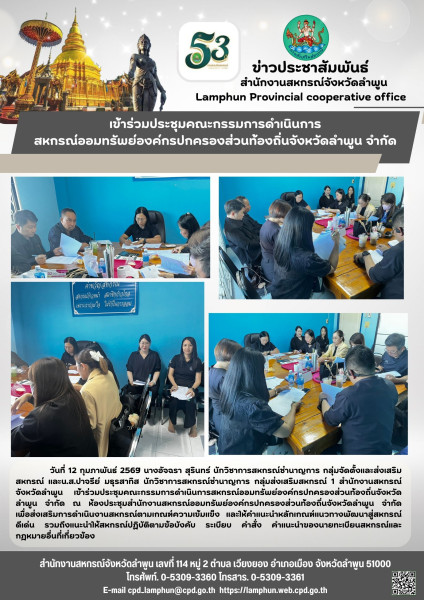 วันที่ 12 กุมภาพันธ์ 2569 นางอัจฉรา สุรินทร์ นักวิชาการสหกรณ์ชำนาญการ กลุ่มจัดตั้งและส่งเสริมสหกรณ์ และน.ส.ปาจรีย์ มธุรสาทิส นักวิชาการสหกรณ์ชำนาญการ กลุ่มส่งเสริมสหกรณ์ 1 สำนักงานสหกรณ์จังหวัดลำพูน เข้าร่วมประชุมคณะกรรมการดำเนินการสหกรณ์ออมทรัพย์องค์กรปกครองส่วนท้องถิ่นจังหวัดลำพูน จำกัด ณ ห้องประชุมสำนักงานสหกรณ์ออมทรัพย์องค์กรปกครองส่วนท้องถิ่นจังหวัดลำพูน จำกัด เพื่อส่งเสริมการดำเนินงานสหกรณ์ตามเกณฑ์ความเข้มแข็ง และให้คำแนะนำหลักเกณฑ์แนวทางพัฒนาสู่สหกรณ์ดีเด่น รวมถึงแนะนำให้สหกรณ์ปฏิบัติตามข้อบังคับ ระเบียบ คำสั่ง คำแนะนำของนายทะเบียนสหกรณ์และกฎหมายอื่นที่เกี่ยวข้อง