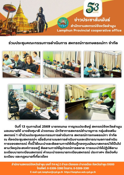 วันที่ 13 กุมภาพันธ์ 2569 นายจณภพ กาญจนประดิษฐ์ สหกรณ์จังหวัดลำพูน มอบหมายให้ นางอังศุมาลี ม่วงเกษม นักวิชาการสหกรณ์ชำนาญการ กลุ่มส่งเสริมสหกรณ์ 1 เข้าร่วมประชุมคณะกรรมการดำเนินการ สหกรณ์การเกษตรแม่ทา จำกัด ณ ห้องประชุมสหกรณ์ฯ เพื่อรับทราบผลการดำเนินงานและพิจารณาผลการดำเนินการของสหกรณ์ ทั้งนี้ได้แนะนำและติดตามการใช้เงินกู้กองทุนพัฒนาสหกรณ์ให้เป็นไปตามวัตถุประสงค์การขอกู้ ติดตามการใช้อุปกรณ์การตลาด การแนะนำให้ปฏิบัติตามระเบียบนายทะเบียนสหกรณ์ คำแนะนำของนายทะเบียนสหกรณ์ ประกาศฯ ข้อบังคับ ระเบียบ และกฎหมายที่เกี่ยวข้อง