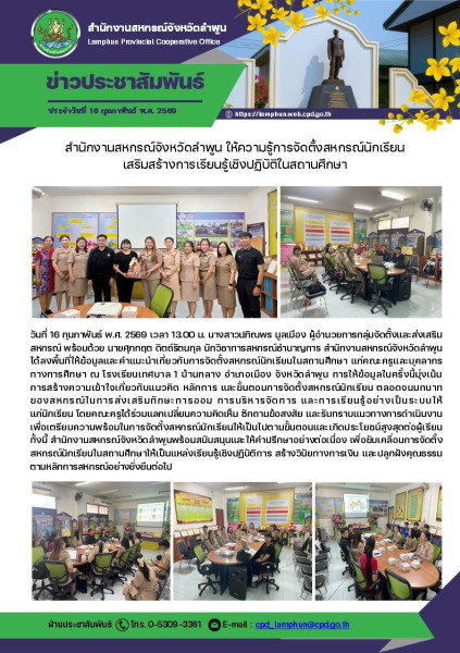 วันที่ 16 กุมภาพันธ์ พ.ศ. 2569 เวลา 13.00 น. นางสาวปภิณพร มูลเมือง ผู้อำนวยการกลุ่มจัดตั้งและส่งเสริมสหกรณ์ พร้อมด้วย นายศุภกฤต ดิตถ์รัตนกุล นักวิชาการสหกรณ์ชำนาญการ สำนักงานสหกรณ์จังหวัดลำพูน ได้ลงพื้นข้อมูลและคำแนะนำเกี่ยวกับการจัดตั้งสหกรณ์นักเรียนในสถานศึกษา แก่คณะครูและบุคลากรทางการศึกษที่ให้า ณ โรงเรียนเทศบาล 1 บ้านกลาง อำเภอเมือง จังหวัดลำพูน การให้ข้อมูลในครั้งนี้มุ่งเน้นการสร้างความเข้าใจเกี่ยวกับแนวคิด หลักการ และขั้นตอนการจัดตั้งสหกรณ์นักเรียน ตลอดจนบทบาทของสหกรณ์ในการส่งเสริมทักษะการออม การบริหารจัดการ และการเรียนรู้อย่างเป็นระบบให้แก่นักเรียน โดยคณะครูได้ร่วมแลกเปลี่ยนความคิดเห็น ซักถามข้อสงสัย และรับทราบแนวทางการดำเนินงานเพื่อเตรียมความพร้อมในการจัดตั้งสหกรณ์นักเรียนให้เป็นไปตามขั้นตอนและเกิดประโยชน์สูงสุดต่อผู้เรียน ทั้งนี้ สำนักงานสหกรณ์จังหวัดลำพูนพร้อมสนับสนุนและให้คำปรึกษาอย่างต่อเนื่อง เพื่อขับเคลื่อนการจัดตั้งสหกรณ์นักเรียนในสถานศึกษาให้เป็นแหล่งเรียนรู้เชิงปฏิบัติการ สร้างวินัยทางการเงิน และปลูกฝังคุณธรรมตามหลักการสหกรณ์อย่างยั่งยืนต่อไป
