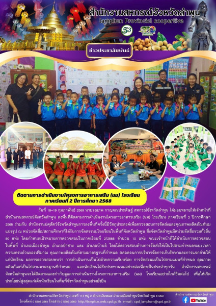 วันที่ 18–19 กุมภาพันธ์ 2569 นายจณภพ กาญจณประดิษฐ์ สหกรณ์จังหวัดลำพูน ได้มอบหมายให้เจ้าหน้าที่สำนักงานสหกรณ์จังหวัดลำพูน ลงพื้นที่ติดตามการดำเนินงานโครงการอาหารเสริม (นม) โรงเรียน ภาคเรียนที่ 2 ปีการศึกษา 2568 ร่วมกับ สำนักงานปศุสัตว์จังหวัดลำพูนการลงพื้นที่ครั้งนี้มีวัตถุประสงค์เพื่อตรวจสอบการจัดส่งและคุณภาพผลิตภัณฑ์นมแปรรูป ณ หน่วยจัดซื้อ/สถานศึกษาที่ได้รับการจัดสรรนมโรงเรียนในพื้นที่จังหวัดลำพูน ซึ่งจังหวัดลำพูนมีหน่วยจัดซื้อรวมทั้งสิ้น 80 แห่ง โดยกำหนดเป้าหมายการตรวจสอบในภาคเรียนที่ 2/2568 จำนวน 10 แห่ง คณะเจ้าหน้าที่ได้ดำเนินการตรวจสอบในพื้นที่ อำเภอเมืองลำพูน อำเภอป่าซาง และ อำเภอบ้านธิ โดยได้ตรวจสอบด้านการจัดส่งให้เป็นไปตามกำหนดระยะเวลา ความครบถ้วนของปริมาณ คุณภาพผลิตภัณฑ์ตามมาตรฐานที่กำหนด ตลอดจนการบริหารจัดการเก็บรักษาและการแจกจ่ายให้แก่นักเรียน ผลการตรวจสอบพบว่า การดำเนินงานเป็นไปด้วยความเรียบร้อย การจัดส่งนมเป็นไปตามแผนที่กำหนด คุณภาพผลิตภัณฑ์เป็นไปตามมาตรฐานที่กำหนด และนักเรียนได้รับประทานนมอย่างต่อเนื่องเป็นประจำทุกวัน สำนักงานสหกรณ์จังหวัดลำพูนจะได้ติดตามและกำกับดูแลการดำเนินงานโครงการอาหารเสริม (นม) โรงเรียนอย่างใกล้ชิดต่อไป เพื่อให้เกิดประโยชน์สูงสุดแก่เด็กนักเรียนในพื้นที่จังหวัดลำพูนอย่างยั่งยืน