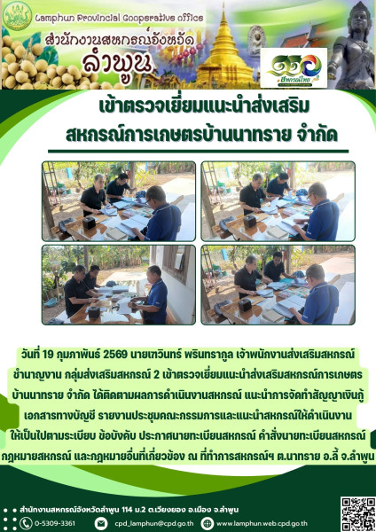 วันที่ 19 กุมภาพันธ์ 2569 นายเฑวินทร์ พรินทรากูล เจ้าพนักงานส่งเสริมสหกรณ์ชำนาญงาน กลุ่มส่งเสริมสหกรณ์ 2 เข้าตรวจเยี่ยมแนะนำส่งเสริมสหกรณ์การเกษตรบ้านนาทราย จำกัด ได้ติดตามผลการดำเนินงานสหกรณ์ แนะนำการจัดทำสัญญาเงินกู้ เอกสารทางบัญชี รายงานประชุมคณะกรรมการและแนะนำสหกรณ์ให้ดำเนินงานให้เป็นไปตามระเบียบ ข้อบังคับ ประกาศนายทะเบียนสหกรณ์ คำสั่งนายทะเบียนสหกรณ์ กฎหมายสหกรณ์ และกฎหมายอื่นที่เกี่ยวข้อง ณ ที่ทำการสหกรณ์ฯ ต.นาทราย อ.ลี้ จ.ลำพูน