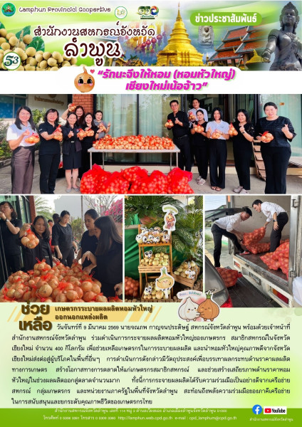 วันที่ 9 มีนาคม 2569 นายจณภพ กาญจนประดิษฐ์ สหกรณ์จังหวัดลำพูน พร้อมด้วยเจ้าหน้าที่สำนักงานสหกรณ์จังหวัดลำพูน ร่วมดำเนินการกระจายผลผลิตหอมหัวใหญ่ของเกษตรกร สมาชิกสหกรณ์ในจังหวัดเชียงใหม่ จำนวน 400 กิโลกรัม เพื่อช่วยเหลือเกษตรกรในการระบายผลผลิต และนำหอมหัวใหญ่คุณภาพดีจากจังหวัดเชียงใหม่ส่งต่อสู่ผู้บริโภคในพื้นที่อื่นๆ การดำเนินการดังกล่าวมีวัตถุประสงค์เพื่อบรรเทาผลกระทบด้านราคาผลผลิตทางการเกษตร สร้างโอกาสทางการตลาดให้แก่เกษตรกรสมาชิกสหกรณ์ และช่วยสร้างเสถียรภาพด้านราคาหอมหัวใหญ่ในช่วงผลผลิตออกสู่ตลาดจำนวนมาก ทั้งนี้การกระจายผลผลิตได้รับความร่วมมือเป็นอย่างดีจากเครือข่ายสหกรณ์ กลุ่มเกษตรกร และหน่วยงานภาครัฐในพื้นที่จังหวัดลำพูน สะท้อนถึงพลังความร่วมมือของภาคีเครือข่ายในการสนับสนุนและยกระดับคุณภาพชีวิตของเกษตรกรไทย