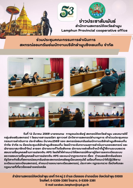 วันที่ 12 มีนาคม 2569 นายจณภพ กาญจนประดิษฐ์ สหกรณ์จังหวัดลำพูน มอบหมายให้ กลุ่มส่งเสริมสหกรณ์ 1 โดยนางสาวพรณิชา สุภาวงค์ นักวิชาการสหกรณ์ชำนาญการ เข้าร่วมประชุมคณะกรรมการดำเนินการ ประจำเดือน มีนาคม2569 ของ สหกรณ์ออมทรัพย์พนักงานบริษัทลำพูนซิงเดนเก็น จำกัด จำกัด ณ ห้องประชุมบริษัทลำพูนซิงเดนเก็น โดยมีวาระรับทราบผลการดำเนินงานของสหกรณ์ และพิจารณาสมาชิกเข้าใหม่ ลาออก พิจารณาแก้ไขข้อสังเกต พิจารณาแต่งตั้งเจ้าหน้าที่ผู้ใช้งานระบบตรวจสอบรายชื่อบุคคลด้านการฟอกเงิน APS โดยได้ให้คำแนะนำให้สหกรณ์ศึกษาคู่มือการลงทะเบียนระบบตรวจสอบรายชื่อบุคคลด้านการฟอกเงิน APS และแนะนำกฎกระทรวง เรื่อง กำหนดหลักทรัพย์ของรัฐวิสาหกิจอื่นที่สหกรณ์ออมทรัพย์และสหกรณ์เครดิตยูเนี่ยนลงทุนได้ พร้อมทั้งแนะนำให้ปฏิบัติตามระเบียบนายทะเบียนสหกรณ์, คำแนะนำของนายทะเบียนสหกรณ์, ประกาศฯ กฎกระทรวง ข้อบังคับและกฎหมายที่เกี่ยวข้องอย่างเคร่งครัด