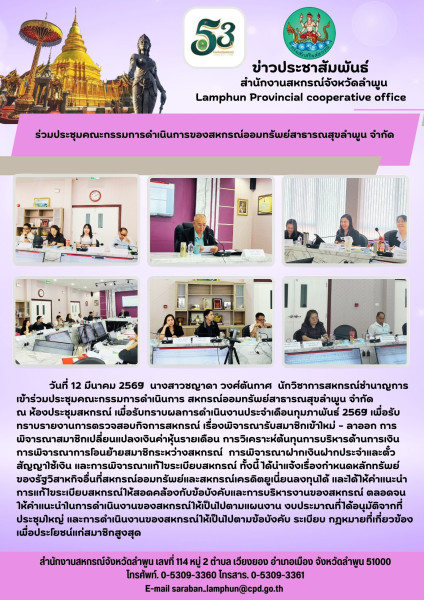 วันที่ 12 มีนาคม 2569 นางสาวชญาดา วงศ์ตันกาศ นักวิชาการสหกรณ์ชำนาญการ เข้าร่วมประชุมคณะกรรมการดำเนินการ สหกรณ์ออมทรัพย์สาธารณสุขลำพูน จำกัด ณ ห้องประชุมสหกรณ์ เพื่อรับทราบผลการดำเนินงานประจำเดือนกุมภาพันธ์ 2569 เพื่อรับทราบรายงานการตรวจสอบกิจการสหกรณ์ เรื่องพิจารณารับสมาชิกเข้าใหม่ - ลาออก การพิจารณาสมาชิกเปลี่ยนแปลงเงินค่าหุ้นรายเดือน การวิเคราะห์ต้นทุนการบริหารด้านการเงิน การพิจารณาการโอนย้ายสมาชิกระหว่างสหกรณ์ การพิจารณาฝากเงินฝากประจำและตั๋วสัญญาใช้เงิน และการพิจารณาแก้ไขระเบียบสหกรณ์ ทั้งนี้ ได้นำแจ้งเรื่องกำหนดหลักทรัพย์ของรัฐวิสาหกิจอื่นที่สหกรณ์ออมทรัพย์และสหกรณ์เครดิตยูเนี่ยนลงทุนได้ และได้ให้คำแนะนำ การแก้ไขระเบียบสหกรณ์ให้สอดคล้องกับข้อบังคับและการบริหารงานของสหกรณ์ ตลอดจนให้คำแนะนำในการดำเนินงานของสหกรณ์ให้เป็นไปตามแผนงาน งบประมาณที่ได้อนุมัติจากที่ประชุมใหญ่ และการดำเนินงานของสหกรณ์ให้เป็นไปตามข้อบังคับ ระเบียบ กฎหมายที่เกี่ยวข้อง เพื่อประโยชน์แก่สมาชิกสูงสุด
