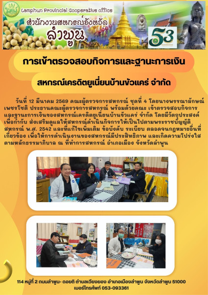 วันที่ 12 มีนาคม 2569 คณะผู้ตรวจการสหกรณ์ ชุดที่ 4 โดยนางพรรณาลักษณ์ เพชรโชติ ประธานคณะผู้ตรวจการสหกรณ์ พร้อมด้วยคณะเข้าตรวจสอบกิจการและฐานะการเงินของสหกรณ์เครดิตยูเนี่ยนบ้านขัวแคร่ จำกัด โดยมีวัตถุประสงค์เพื่อกำกับ ส่งเสริม ดูแลให้สหกรณ์ดำเนินกิจการให้เป็นไปตามพระราชบัญญัติสหกรณ์ พ.ศ. 2542 และที่แก้ไขเพิ่มเติม ข้อบังคับ ระเบียบ ตลอดจน กฎหมายอื่นที่เกี่ยวข้องเพื่อให้การดำเนินงานของสหกรณ์มีประสิทธิภาพ และเกิดความโปร่งใสตามหลักธรรมาภิบาล ณ ที่ทำการสหกรณ์ อำเภอเมือง จังหวัดลำพูน