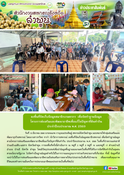 วันที่ 13 มีนาคม 2569 นายจณภพ กาญจณประดิษฐ์ สหกรณ์จังหวัดลำพูน มอบหมายให้กลุ่มส่งเสริมและพัฒนาธุรกิจสหกรณ์ โดยนางสาวทวีพร ทาก๋า นักวิชาการสหกรณ์ ลงพื้นที่จัดเก็บข้อมูลสมาชิกสหกรณ์ เพื่อจัดทำฐานข้อมูล ตามโครงการส่งเสริมและพัฒนาอาชีพเพื่อแก้ไขปัญหาที่ดินทำกิน ประจำปีงบประมาณ พ.ศ. 2569 ในพื้นที่ป่าสงวนแห่งชาติ ป่าแม่ธิ-แม่ตีบ-แม่สาร จังหวัดลำพูน การลงพื้นที่ครั้งนี้ดำเนินการ ณ หมู่ที่ 2 หมู่ที่ 3 หมู่ที่ 16 และหมู่ที่ 17 ตำบลบ้านธิ อำเภอ บ้านธิ จังหวัด ลำพูน โดยมีวัตถุประสงค์เพื่อนำข้อมูลพื้นฐานของเกษตรในพื้นที่ที่ได้รับการจัดที่ดินทำกินในชุมชนตามนโยบายรัฐบาล ไปจัดทำเป็นฐานข้อมูลสำหรับใช้ในการวางแผนบูรณาการร่วมกับหน่วยงานที่เกี่ยวข้อง ทั้งนี้ ข้อมูลที่ได้จะนำไปใช้ในการส่งเสริมและพัฒนาอาชีพรวมถึงส่งเสริมการตลาดให้แก่ประชาชนในพื้นที่เป้าหมาย เพื่อยกระดับคุณภาพชีวิตและสร้างความมั่นคงในการประกอบอาชีพของประชาชนในพื้นที่ต่อไป