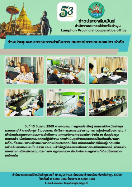 วันที่ 13 มีนาคม 2569 นายจณภพ กาญจนประดิษฐ์ สหกรณ์จังหวัดลำพูน มอบหมายให้ นางอังศุมาลี ม่วงเกษม นักวิชาการสหกรณ์ชำนาญการ กลุ่มส่งเสริมสหกรณ์ 1 เข้าร่วมประชุมคณะกรรมการดำเนินการ สหกรณ์การเกษตรแม่ทา จำกัด ณ ห้องประชุมสหกรณ์ฯ เพื่อรับทราบผลการปฏิบัติงาน การดำเนินธุรกิจของสหกรณ์ในเดือนที่ผ่านมา พร้อมทั้งแนะนำตามคำแนะนำนายทะเบียนสหกรณ์เรื่อง หลักเกณฑ์การให้เงินกู้แก่สมาชิกอย่างรับผิดชอบและเป็นธรรม และแนะนำให้ปฏิบัติตามระเบียบนายทะเบียนสหกรณ์, คำแนะนำของนายทะเบียนสหกรณ์, ประกาศฯ กฎกระทรวง ข้อบังคับและกฎหมายที่เกี่ยวข้องอย่างเคร่งครัด