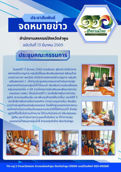 วันที่ 13 มีนาคม 2569 นางอัจฉรา สุรินทร์ นักวิชาการสหกรณ์ชำนาญการ กลุ่มจัดตั้งและส่งเสริมสหกรณ์ พร้อมด้วยนางสาวชวาลา พลเวียง นักวิชาการสหกรณ์ชำนาญการ กลุ่มส่งเสริมสหกรณ์ 2 เข้าร่วมประชุมคณะกรรมการดำเนินการกลุ่มเกษตรกรทำสวนยางลุ่มน้ำลี้ ได้แนะนำ ส่งเสริมความเข้มแข็งของกลุ่มเกษตรกรใน 4 มิติ ตามโครงการส่งเสริมและพัฒนาสถาบันเกษตรกร (กพก.) ซึ่งเน้นในมิติที่ 2 ประสิทธิภาพในการดำเนินธุรกิจ (ระดมทุนเรือนหุ้น และเพิ่มทุนสำรองให้มากขึ้น) และมิติที่ 3 ประสิทธิภาพในการจัดการองค์กร (การควบคุมภายใน) ส่งเสริมการดำเนินธุรกิจของกลุ่มเกษตรกร โดยให้กลุ่มเกษตรกรรายงานผลการดำเนินงานเทียบกับแผนงานประจำปีที่ได้กำหนดไว้ สำหรับธุรกิจที่ไม่เป็นไปตามเป้าหมาย ได้ร่วมกันวิเคราะห์ ปรับปรุงแผนธุรกิจ และดำเนินการตามแผนที่ปรับใหม่ ณ ที่ทำการกลุ่มเกษตรกรทำสวนยางลุ่มน้ำลี้ อำเภอทุ่งหัวช้าง จังหวัดลำพูน