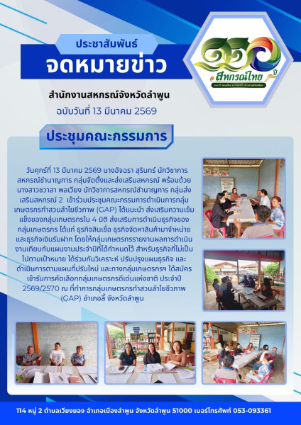 วันที่ 13 มีนาคม 2569 นางอัจฉรา สุรินทร์ นักวิชาการสหกรณ์ชำนาญการ กลุ่มจัดตั้งและส่งเสริมสหกรณ์ พร้อมด้วยนางสาวชวาลา พลเวียง นักวิชาการสหกรณ์ชำนาญการ กลุ่มส่งเสริมสหกรณ์ 2 เข้าร่วมประชุมคณะกรรมการดำเนินการกลุ่มเกษตรกรทำสวนลำไยชีวภาพ (GAP) ได้แนะนำ ส่งเสริมความเข้มแข็งของกลุ่มเกษตรกรใน 4 มิติ ส่งเสริมการดำเนินธุรกิจของกลุ่มเกษตรกร ได้แก่ ธุรกิจสินเชื่อ ธุรกิจจัดหาสินค้ามาจำหน่าย และธุรกิจเงินรับฝาก โดยให้กลุ่มเกษตรกรรายงานผลการดำเนินงานเทียบกับแผนงานประจำปีที่ได้กำหนดไว้ สำหรับธุรกิจที่ไม่เป็นไปตามเป้าหมาย ได้ร่วมกันวิเคราะห์ ปรับปรุงแผนธุรกิจ และดำเนินการตามแผนที่ปรับใหม่ และทางกลุ่มเกษตรกรฯ ได้สมัครเข้ารับการคัดเลือกกลุ่มเกษตรกรดีเด่นแห่งชาติ ประจำปี 2569/2570 ณ ที่ทำการกลุ่มเกษตรกรทำสวนลำไยชีวภาพ (GAP) อำเภอลี้ จังหวัดลำพูน
