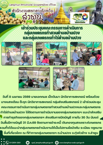 วันที่ 8 เมษายน 2569 นายเอกกมล เป็งวันนา นักวิชาการสหกรณ์ พร้อมด้วยนางแสงเดือน ต๊ะดุก นักวิชาการสหกรณ์ กลุ่มส่งเสริมสหกรณ์ 2 เข้าร่วมประชุมคณะกรรมการดำเนินการกลุ่มเกษตรกรทำสวนตำบลบ้านปวงและกลุ่มเกษตรกรทำไร่ตำบลบ้านปวง ได้ติดตามการดำเนินงานของกลุ่มเกษตรกรฯ แนะนำส่งเสริมการทำธุรกิจของกลุ่มเกษตรกรฯ ส่งเสริมการปิดบัญชี ภายใน 30 วัน นับแต่วันสิ้นปีทางบัญชี 31 มี.ค.69 ติดตามการชำระหนี้ เงินกองทุนสงเคราะห์เกษตรกร รวมทั้งได้แนะนำกลุ่มเกษตรกรดำเนินงานให้เป็นไปตามข้อบังคับ ระเบียบ กฎหมายอื่นที่เกี่ยวข้อง ณ ที่ทำการกลุ่มเกษตรกรฯ ต.บ้านปวง อ.ทุ่งหัวช้าง จ.ลำพูน