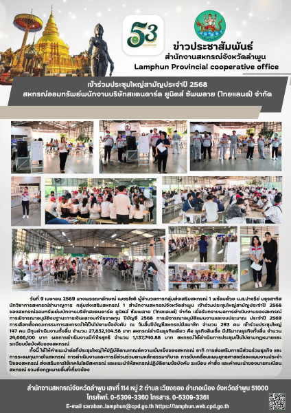 วันที่ 9 เมษายน 2569 นางพรรณาลักษณ์ เพชรโชติ ผู้อำนวยการกลุ่มส่งเสริมสหกรณ์ 1 พร้อมด้วย น.ส.ปาจรีย์ มธุรสาทิส นักวิชาการสหกรณ์ชำนาญการ กลุ่มส่งเสริมสหกรณ์ 1 สำนักงานสหกรณ์จังหวัดลำพูน เข้าร่วมประชุมใหญ่สามัญประจำปี 2568 ของสหกรณ์ออมทรัพย์พนักงานบริษัทสแตนดาร์ด ยูนิตส์ ซัพพลาย (ไทยแลนด์) จำกัด เพื่อรับทราบผลการดำเนินงานของสหกรณ์ การพิจารณาอนุมัติงบฐานะการเงินและงบกำไรขาดทุน ปีบัญชี 2568 การพิจารณาอนุมัติแผนงานและงบประมาณ ประจำปี 2569 การเลือกตั้งคณะกรรมการสหกรณ์ให้เป็นไปตามข้อบังคับ ณ วันสิ้นปีบัญชีสหกรณ์มีสมาชิก จำนวน 293 คน เข้าร่วมประชุมใหญ่ 147 คน มีทุนดำเนินงานทั้งสิ้น จำนวน 27,832,104.58 บาท สหกรณ์ดำเนินธุรกิจเดียว คือ ธุรกิจสินเชื่อ มีปริมาณธุรกิจทั้งสิ้น จำนวน 24,666,100 บาท ผลการดำเนินงานมีกำไรสุทธิ จำนวน 1,137,740.88 บาท สหกรณ์ได้ดำเนินการประชุมเป็นไปตามกฎหมายและระเบียบข้อบังคับของสหกรณ์ ทั้งนี้ ได้ให้คำแนะนำต่อที่ประชุมใหญ่ให้ปฏิบัติตามเกณฑ์ความเข้มแข็งของสหกรณ์ อาทิ การส่งเสริมการมีส่วนร่วมธุรกิจ และการระดมทุนภายในสหกรณ์ การดำเนินงานและการมีส่วนร่วมตามหลักธรรมาภิบาล การขับเคลื่อนแผนยุทธศาสตร์และแผนงานประจำปีของสหกรณ์ ส่งเสริมการใช้เทคโนโลยีสหกรณ์ และแนะนำให้สหกรณ์ปฏิบัติตามข้อบังคับ ระเบียบ คำสั่ง และคำแนะนำของนายทะเบียนสหกรณ์ รวมถึงกฎหมายอื่นที่เกี่ยวข้อง