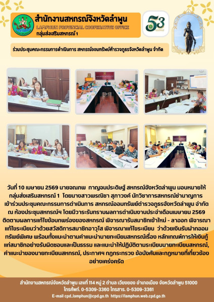 วันที่ 10 เมษายน 2569 นายจณภพ กาญจนประดิษฐ์ สหกรณ์จังหวัดลำพูน มอบหมายให้ กลุ่มส่งเสริมสหกรณ์ 1 โดยนางสาวพรณิชา สุภาวงค์ นักวิชาการสหกรณ์ชำนาญการ เข้าร่วมประชุมคณะกรรมการดำเนินการ สหกรณ์ออมทรัพย์ตำรวจภูธรจังหวัดลำพูน จำกัด ณ ห้องประชุมสหกรณ์ฯ โดยมีวาระรับทราบผลการดำเนินงานประจำเดือนเมษายน 2569 ติดตามผลการแก้ไขข้อบกพร่องของสหกรณ์ พิจารณารับสมาชิกเข้าใหม่ - ลาออก พิจารณาแก้ไขระเบียบว่าด้วยสวัสดิการสมาชิกอาวุโส พิจารณาแก้ไขระเบียบ ว่าด้วยเงินรับฝากออมทรัพย์พิเศษ พร้อมทั้งแนะนำตามคำแนะนำนายทะเบียนสหกรณ์เรื่อง หลักเกณฑ์การให้เงินกู้แก่สมาชิกอย่างรับผิดชอบและเป็นธรรม และแนะนำให้ปฏิบัติตามระเบียบนายทะเบียนสหกรณ์, คำแนะนำของนายทะเบียนสหกรณ์, ประกาศฯ กฎกระทรวง ข้อบังคับและกฎหมายที่เกี่ยวข้องอย่างเคร่งครัด