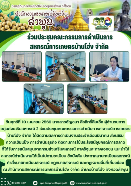 วันที่ 10 เมษายน 2569 นางสาวอัญชนา สิรสิทธิ์สืบเชื้อ ผู้อำนวยการกลุ่มส่งเสริมสหกรณ์ 2 ร่วมประชุมคณะกรรมการดำเนินการสหกรณ์การเกษตรบ้านโฮ่ง จำกัด ได้ติดตามผลการดำเนินงานประจำเดือนมีนาคม ส่งเสริมความเข้มแข็ง การดำเนินธุรกิจ ติดตามการใช้ประโยชน์อุปกรณ์การตลาดที่ได้รับการสนับสนุนจากกรมส่งเสริมสหกรณ์ ภาครัฐและภาคเอกชน แนะนำให้สหกรณ์ดำเนินงานให้เป็นไปตามระเบียบ ข้อบังคับ ประกาศนายทะเบียนสหกรณ์ คำสั่งนายทะเบียนสหกรณ์ กฎหมายสหกรณ์ และกฎหมายอื่นที่เกี่ยวข้อง ณ สำนักงานสหกรณ์การเกษตรบ้านโฮ่ง จำกัด อำเภอบ้านโฮ่ง จังหวัดลำพูน