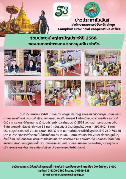 วันที่ 22 เมษายน 2569 นายจณภพ กาญจนประดิษฐ์ สหกรณ์จังหวัดลำพูน มอบหมายให้ นางพรรณาลักษณ์ เพชรโชติ ผู้อำนวยการกลุ่มส่งเสริมสหกรณ์ 1 พร้อมด้วยนางสาวพรณิชา สุภาวงค์นักวิชาการสหกรณ์ชำนาญการ เข้าร่วมประชุมใหญ่สามัญประจำปี 2568 สหกรณ์การเกษตรทาขุมเงิน จำกัด สหกรณ์ฯ มีสมาชิกทั้งหมด 58 คน ดำเนินธุรกิจ 3 ด้าน มีทุนดำเนินงาน 4,397,542.14 บาท ปริมาณธุรกิจระหว่างปี จำนวน 4,084,355.37 บาท ผลการดำเนินงานมีกำไรสุทธิประจำปี 260,703.86 บาท สหกรณ์จัดสรรกำไรสุทธิเป็นไปตามข้อบังคับ เสนออนุมัติแผนงานประจำปี 2569 ต่อที่ประชุมใหญ่ ทั้งนี้ได้แนะนำให้สหกรณ์ฯ ดำเนินการส่งเสริมและพัฒนาอาชีพเสริมเพื่อเพิ่มรายได้ และลดค่าใช้จ่ายให้กับสมาชิกในสภาวะเศรษฐกิจตกต่ำ รวมถึงการส่งเสริมให้สมาชิกและสหกรณ์นำหลักปรัชญาเศรษฐกิจมาบริหารงานสหกรณ์และเศรษฐกิจครัวเรือน เพื่อลดค่าครองชีพให้แก่สมาชิก
