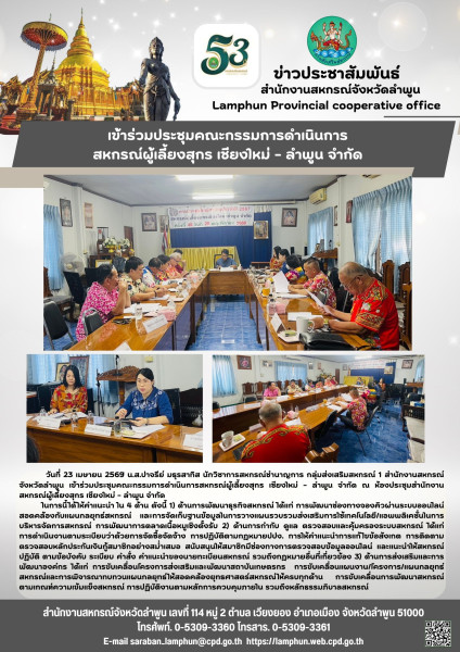 วันที่ 23 เมษายน 2569 น.ส.ปาจรีย์ มธุรสาทิส นักวิชาการสหกรณ์ชำนาญการ กลุ่มส่งเสริมสหกรณ์ 1 สำนักงานสหกรณ์จังหวัดลำพูน เข้าร่วมประชุมคณะกรรมการดำเนินการสหกรณ์ผู้เลี้ยงสุกร เชียงใหม่ - ลำพูน จำกัด ณ ห้องประชุมสำนักงานสหกรณ์ผู้เลี้ยงสุกร เชียงใหม่ - ลำพูน จำกัด ในการนี้ได้ให้คำแนะนำ ใน 4 ด้าน ดังนี้ 1) ด้านการพัฒนาธุรกิจสหกรณ์ ได้แก่ การพัฒนาช่องทางจองคิวผ่านระบบออนไลน์สอดคล้องกับแผนกลยุทธ์สหกรณ์ และการจัดเก็บฐานข้อมูลในการวางแผนรวบรวมส่งเสริมการใช้เทคโนโลยี/แอพพลิเคชั่นในการบริหารจัดการสหกรณ์ การพัฒนาการตลาดเนื้อหมูเชิงตั้งรับ 2) ด้านการกำกับ ดูแล ตรวจสอบและคุ้มครองระบบสหกรณ์ ได้แก่ การดำเนินงานตามระเบียบว่าด้วยการจัดซื้อจัดจ้าง การปฏิบัติตามกฎหมายปปง. การให้คำแนะนำการแก้ไขข้อสังเกต การติดตามตรวจสอบหลักประกันเงินกู้สมาชิกอย่างสม่ำเสมอ สนับสนุนให้สมาชิกมีช่องทางการตรวจสอบข้อมูลออนไลน์ และแนะนำให้สหกรณ์ปฏิบัติ ตามข้อบังคับ ระเบียบ คำสั่ง คำแนะนำของนายทะเบียนสหกรณ์ รวมถึงกฎหมายอื่นที่เกี่ยวข้อง 3) ด้านการส่งเสริมและการพัฒนาองค์กร ได้แก่ การขับเคลื่อนโครงการส่งเสริมและพัฒนาสถาบันเกษตรกร การขับเคลื่อนแผนงาน/โครงการ/แผนกลยุทธ์สหกรณ์และการพิจารณาทบทวนแผนกลยุทธ์ให้สอดคล้องยุทธศาสตร์สหกรณ์ให้ครบทุกด้าน การขับเคลื่อนการพัฒนาสหกรณ์ตามเกณฑ์ความเข้มแข็งสหกรณ์ การปฏิบัติงานตามหลักการควบคุมภายใน รวมถึงหลักธรรมภิบาลสหกรณ์