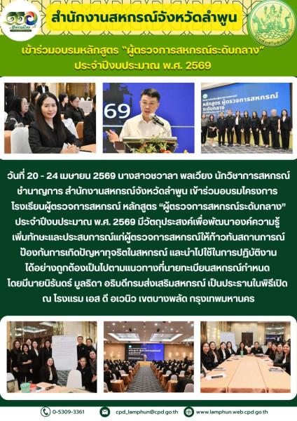 วันที่ 20 - 24 เมษายน 2569 นางสาวชวาลา พลเวียง นักวิชาการสหกรณ์ชำนาญการ สำนักงานสหกรณ์จังหวัดลำพูน เข้าร่วมอบรมโครงการ โรงเรียนผู้ตรวจการสหกรณ์ หลักสูตร “ผู้ตรวจการสหกรณ์ระดับกลาง” ประจำปีงบประมาณ พ.ศ. 2569 มีวัตถุประสงค์เพื่อพัฒนาองค์ความรู้ เพิ่มทักษะและประสบการณ์แก่ผู้ตรวจการสหกรณ์ให้ก้าวทันสถานการณ์ป้องกันการเกิดปัญหาทุจริตในสหกรณ์ และนำไปใช้ในการปฏิบัติงานได้อย่างถูกต้องเป็นไปตามแนวทางที่นายทะเบียนสหกรณ์กำหนด โดยมีนายนิรันดร์ มูลธิดา อธิบดีกรมส่งเสริมสหกรณ์ เป็นประธานในพิธีเปิด ณ โรงแรม เอส ดี อเวนิว เขตบางพลัด กรุงเทพมหานคร