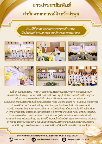 วันที่ 24 เมษายน 2569 สำนักงานสหกรณ์จังหวัดลำพูน นายจณภพ กาญจนประดิษฐ์ สหกรณ์จังหวัดลำพูน มอบหมายให้นางสาวณิชากร บุญบุรี นักจัดการงานทั่วไปชำนาญการ พร้อมบุคลากรฝ่ายบริหารทั่วไป เข้าร่วมพิธีวางพวงมาลาถวายราชสักการะ เนื่องในวันคล้ายวันสวรรคต สมเด็จพระนเรศวรมหาราช ประจำปี 2569 ณ หอประชุมจังหวัดลำพูน ตำบลศรีบัวบาน อำเภอเมืองลำพูน จังหวัดลำพูน โดยมี นายโยธิน ประสงค์ความดี รองผู้ว่าราชการ รักษาราชการแทนผู้ว่าราชการจังหวัดลำพูน เป็นประธานในพิธี พร้อมด้วยนางสาวเบญจวรรณ มีเผือก รองผู้ว่าราชการจังหวัดลำพูน นายปรีชา สมชัย ปลัดจังหวัดลำพูน ข้าราชการพลเรือน ตุลาการ ทหาร ตำรวจ อัยการ ผู้บริหารองค์กรปกครองส่วนท้องถิ่น สมาชิกเหล่ากาชาดจังหวัดลำพูน สมาชิกแม่บ้านมหาดไทยจังหวัดลำพูนและพสกนิกรชาวจังหวัดลำพูนทุกหมู่เหล่าเข้าร่วมในพิธี เพื่อน้อมรำลึกถึงพระมหากรุณาธิคุณและแสดงความกตัญญู-กตเวทิตาคุณ สมเด็จพระนเรศวรมหาราช ที่ทรงมีต่อชาติไทยและประชาชนชาวไทย