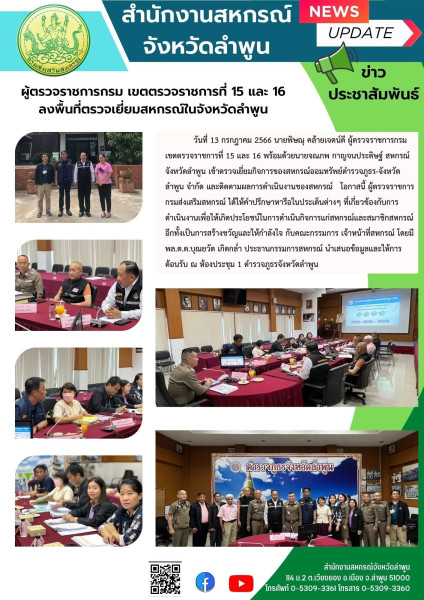วันที่ 13 กรกฎาคม 2566 นายพิษณุ คล้ายเจตน์ดี ผู้ตรวจราชการกรม เขตตรวจราชการที่ 15 และ 16 พร้อมด้วยนายจณภพ กาญจนประดิษฐ์ สหกรณ์จังหวัดลำพูน เข้าตรวจเยี่ยมกิจการของสหกรณ์ออมทรัพย์ตำรวจภูธร-จังหวัดลำพูน จำกัด และติดตามผลการดำเนินงานของสหกรณ์ โอกาสนี้ ผู้ตรวจราชการกรมส่งเสริมสหกรณ์ ได้ให้คำปรึกษาหารือในประเด็นต่างๆ ที่เกี่ยวข้องกับการดำเนินงานเพื่อให้เกิดประโยชน์ในการดำเนินกิจการแก่สหกรณ์และสมาชิกสหกรณ์ อีกทั้งเป็นการสร้างขวัญและให้กำลังใจ กับคณะกรรมการ เจ้าหน้าที่สหกรณ์ โดยมี พล.ต.ต.บุณยวัต เกิดกล่ำ ประธานกรรมการสหกรณ์ นำเสนอข้อมูลและให้การต้อนรับ ณ ห้องประชุม 1 ตำรวจภูธรจังหวัดลำพูน